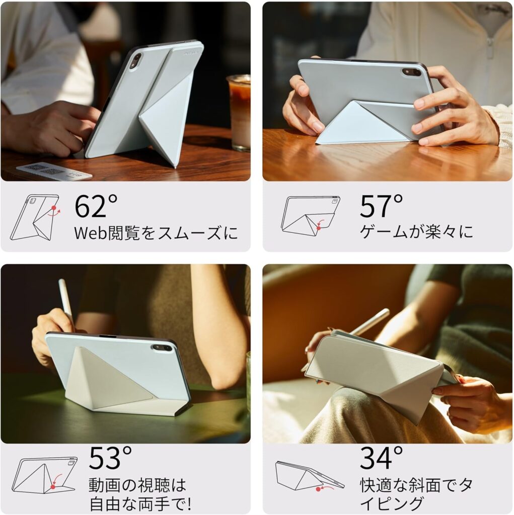 純正ケースに劣らない質感と薄さ、軽さが魅力の保護ケースです。マグネットで装着できるので、着け外しも簡単。そして最大の特徴は4段階のスタンド機能があること。