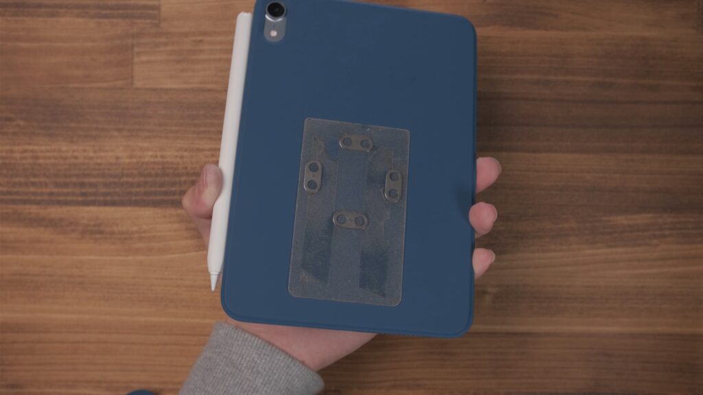 自己流のカスタマイズですが、背面の保護部分にマグネットシールを貼っています。