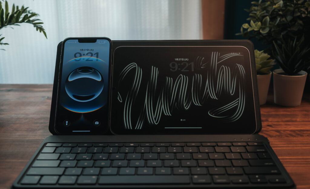 横に並べているおかげで、iPhone → iPad → キーボード の視線移動が自然になります。