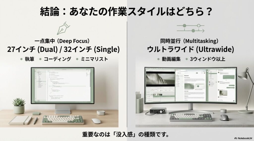 「スペックやサイズは大きい方が良い」という固定観念を手放したとき、私のデスクには心地よい静寂が戻ってきました。