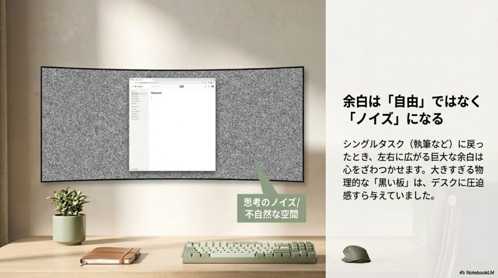 文章を書いていても、視界の端でチャットの通知がちらつき、無意識のうちに集中力が分散していくのです。ウルトラワイドのメリットがデメリットに変わる瞬間でした。