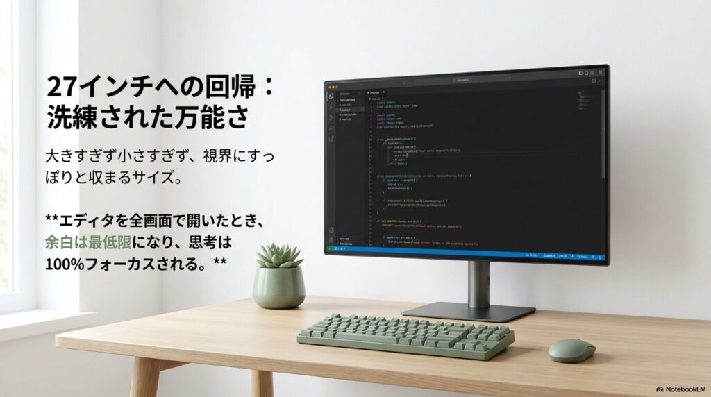 27インチモニターの魅力は、その「洗練された万能さ」にあります。大きすぎず小さすぎず、視界にすっぽりと収まるこのサイズは、シングルタスクへの圧倒的な没入感をもたらしてくれました。