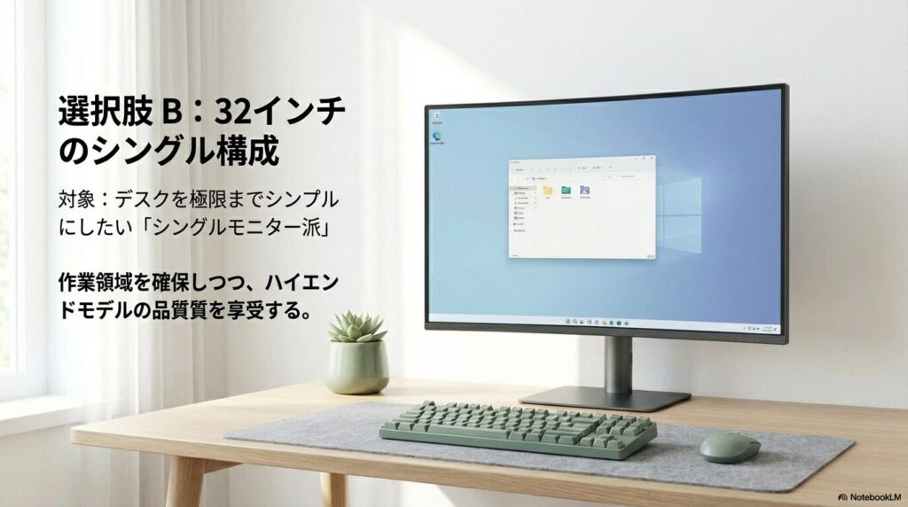一方で、デスクを極限までシンプルに保ちたい「シングルモニター派」は、作業領域を確保しつつ高品質なモデルが多い「32インチ」が適正サイズになるでしょう。