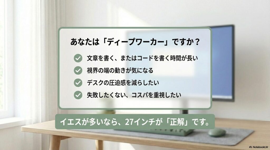 「とりあえず失敗したくない」「コスパ良く快適な環境を作りたい」という方にとって、27インチは間違いなく最強の選択肢と言えます。