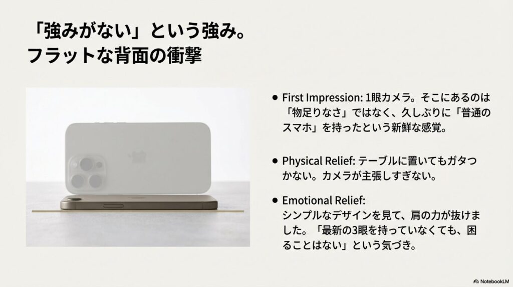 大げさに聞こえるかもしれませんが、このフラットな背面を見て、少し肩の力が抜けました。「別に、最新の3眼カメラを持っていなくても、困ることなんてないんだな」と。