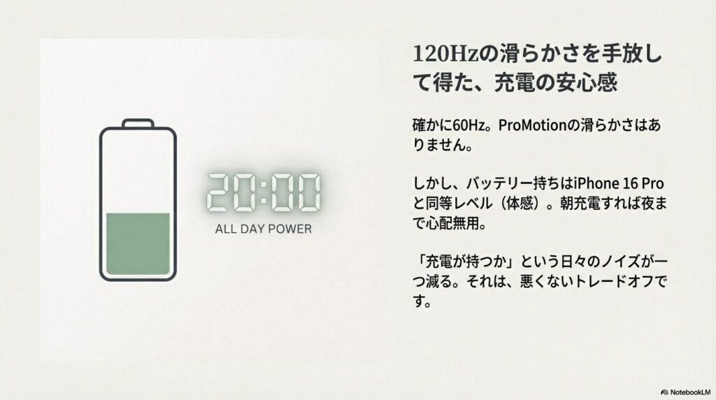 120Hzの滑らかさを手放した代わりに、充電の心配というノイズが一つ減りました。悪くないトレードオフだと感じています。