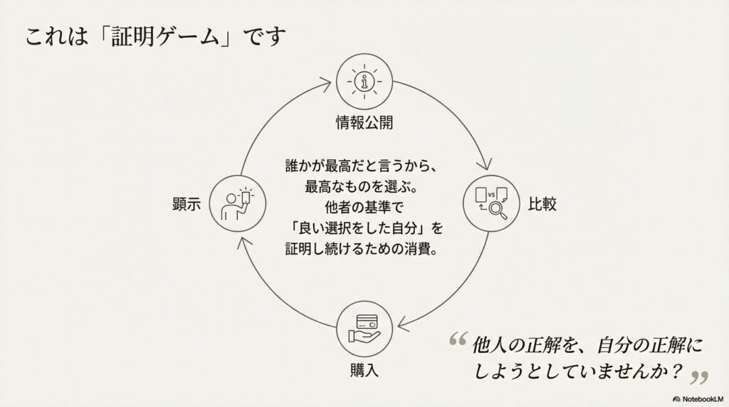 これが「証明ゲーム」の正体だと思っています。誰かが最高だと言うから、最高なものを選ぶ。