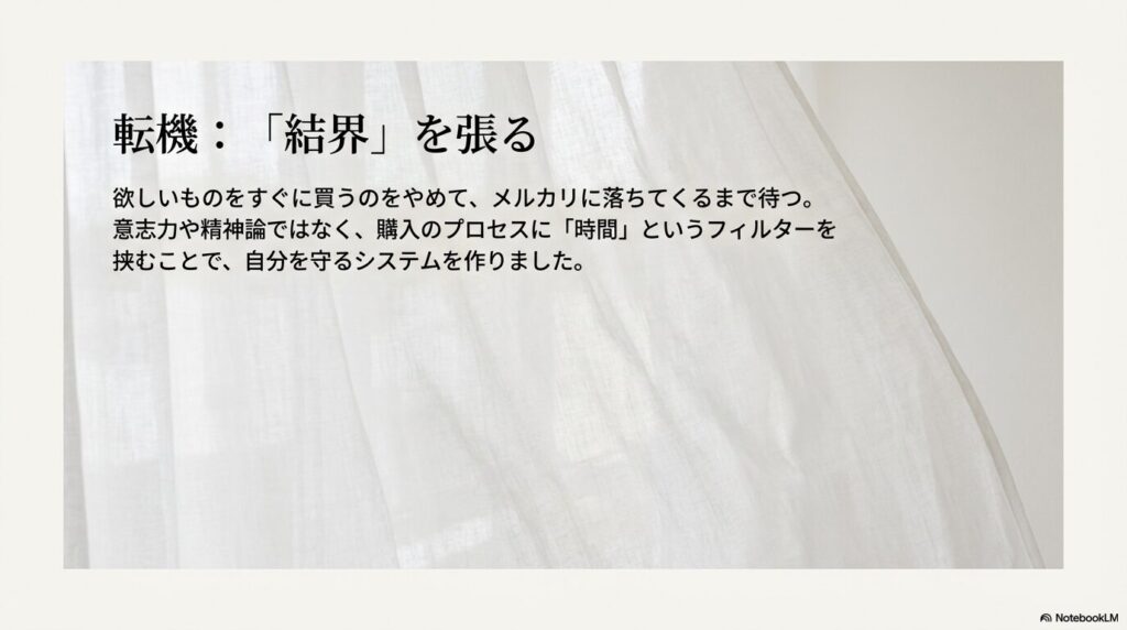 意志力や精神論ではなく、購入のプロセスに時間というフィルターを挟むことで、衝動的な消費をシステムとして防ぐ仕組みです。