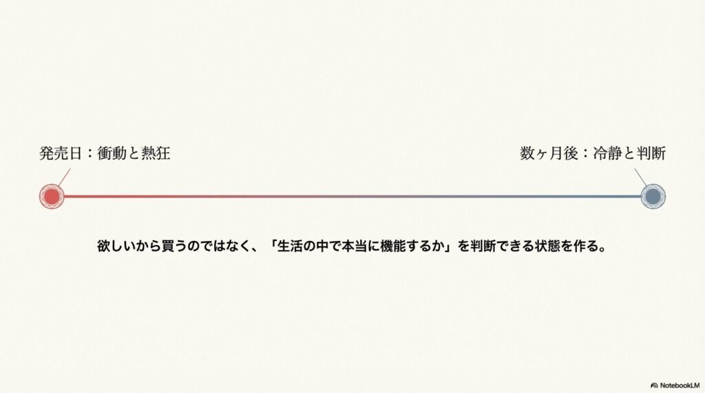 欲しいから買う、ではなく「この道具が自分の生活の中で本当に機能するかを、冷静に判断できる状態を作る」というアプローチへのシフトです。