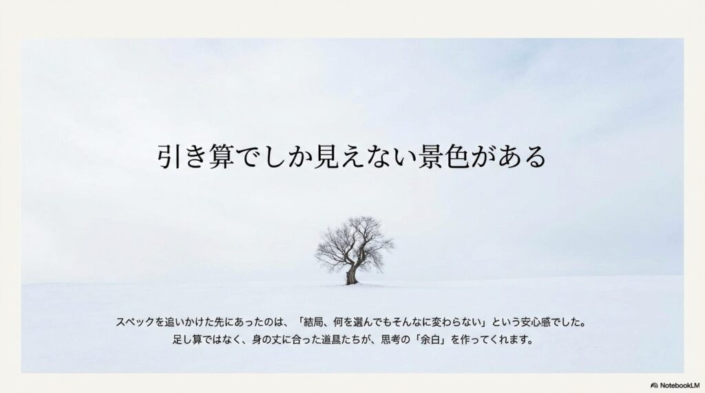 他者の基準で「良い選択をした自分」を証明し続けるための消費。その疲れが積み重なることで、良い道具に囲まれていながらなぜか充足感がない、という状態が続いていました。