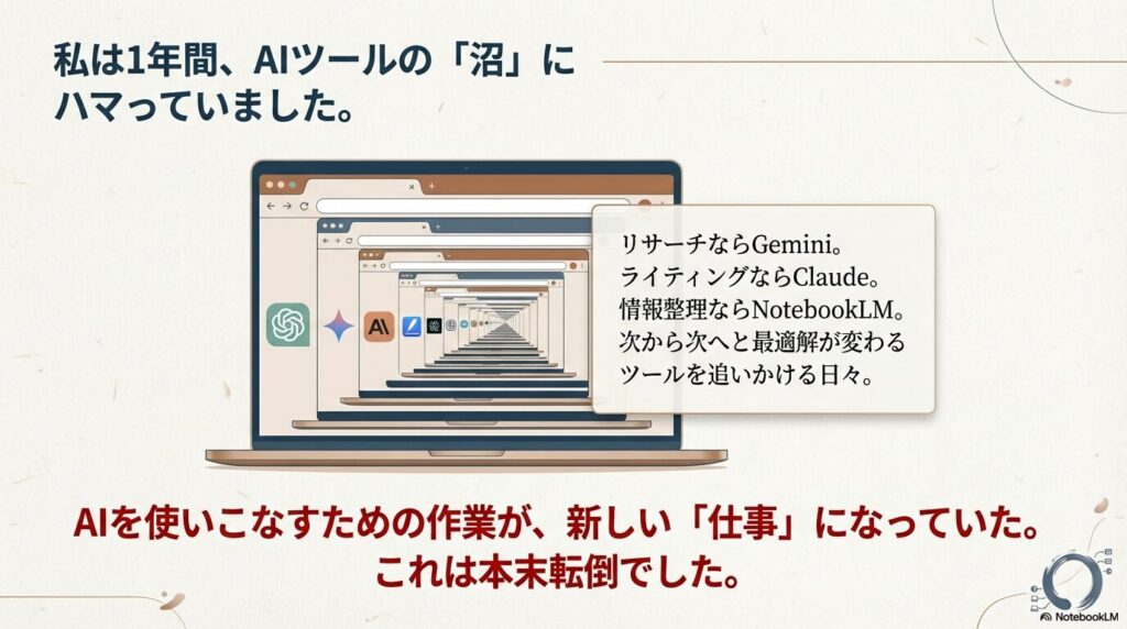 AIを使いこなすための作業が、新しい「仕事」になっていたのです。本末転倒という言葉が、これほどしっくり来た経験は他にありません。