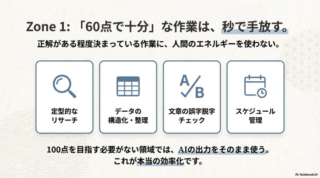 ポイントは「60点で十分な作業」に限定すること。100点を目指す必要がない領域では、AIの出力をそのまま使っても問題ありません。