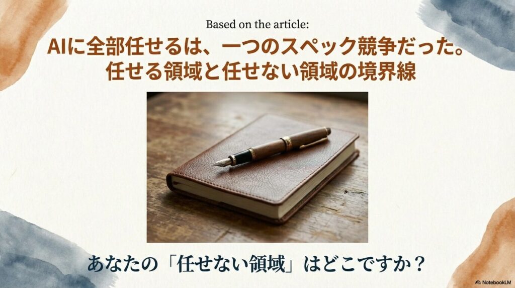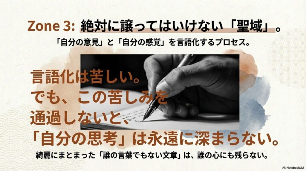 私が「任せない領域」として守っているのは、自分の言葉で考え、自分の言葉で書くプロセスです。このプロセスは時間がかかるし、効率は悪い。