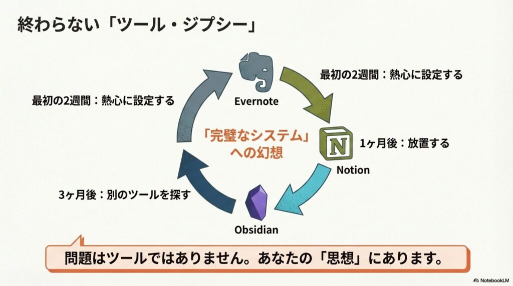 ツールを乗り換えるたびに「今度こそ完璧なシステムが作れる」と思い、移行作業に膨大な時間を費やしました。