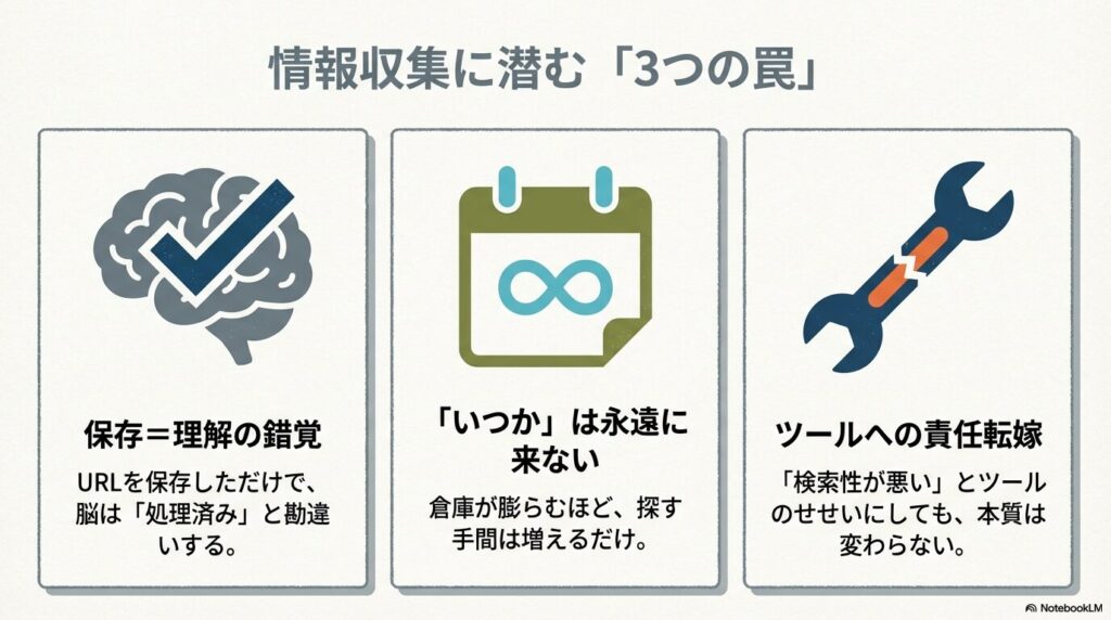 情報を溜める行為には、ある種の心地よさがあります。「保存した」という達成感。「いつでも引き出せる」という安心感。でもこの安心感には罠があります。