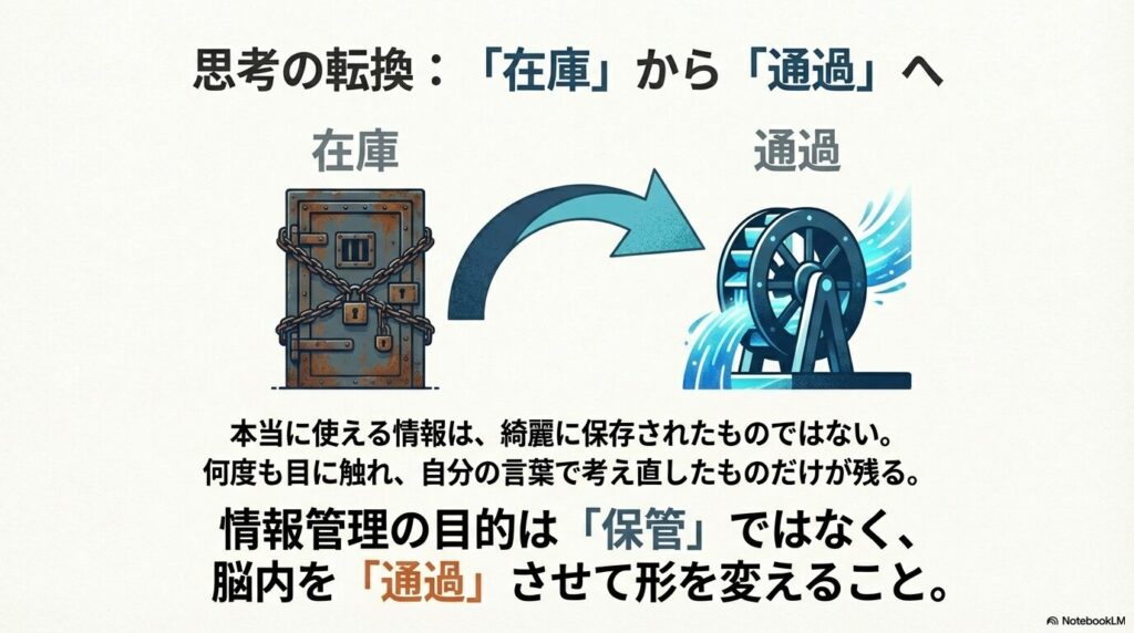 情報を倉庫に入れて鍵をかけるのではなく、自分の思考という水路に流して、通過する過程で形を変えさせる。