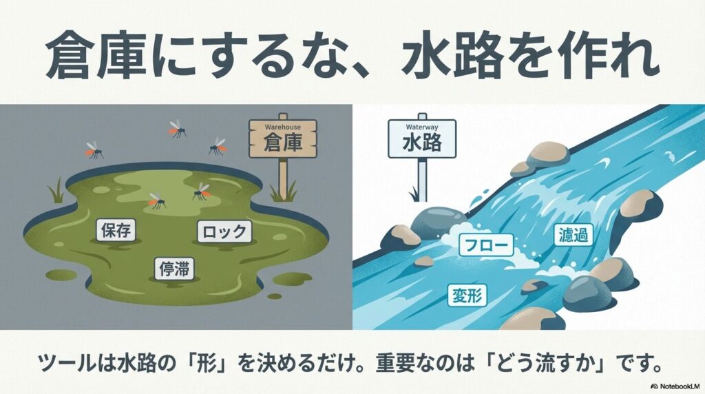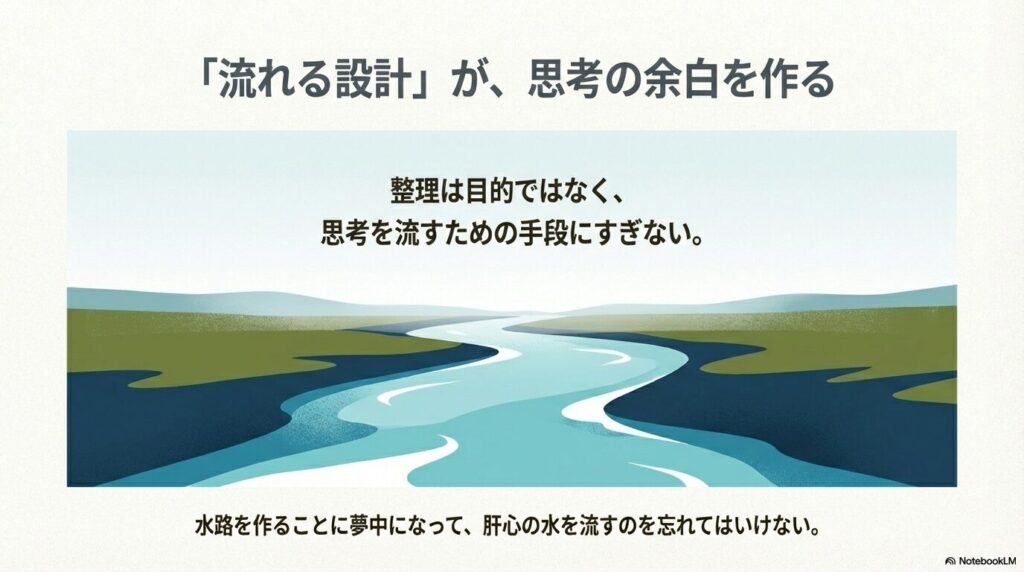 完璧なフォルダ構成も、美しいデータベースも、それ自体は何も生み出しません。整理は目的ではなく、思考を流すための「水路」を整備する手段にすぎない。