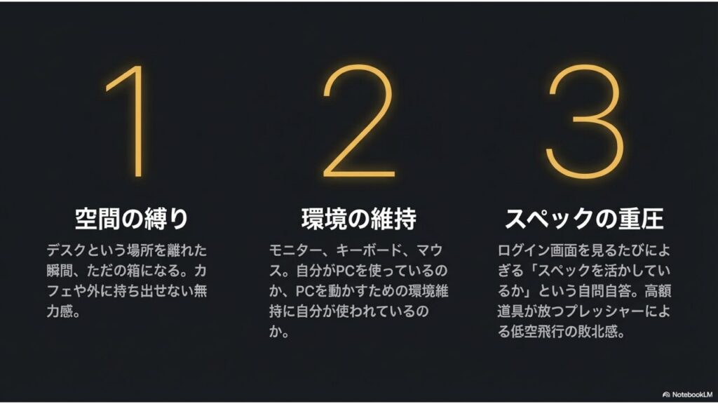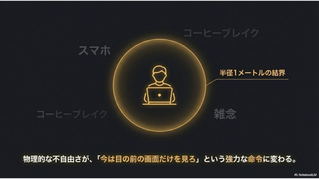 でも、この物理的な不自由さが「今は目の前の画面だけを見ろ」という強力な命令に変わったんです。
