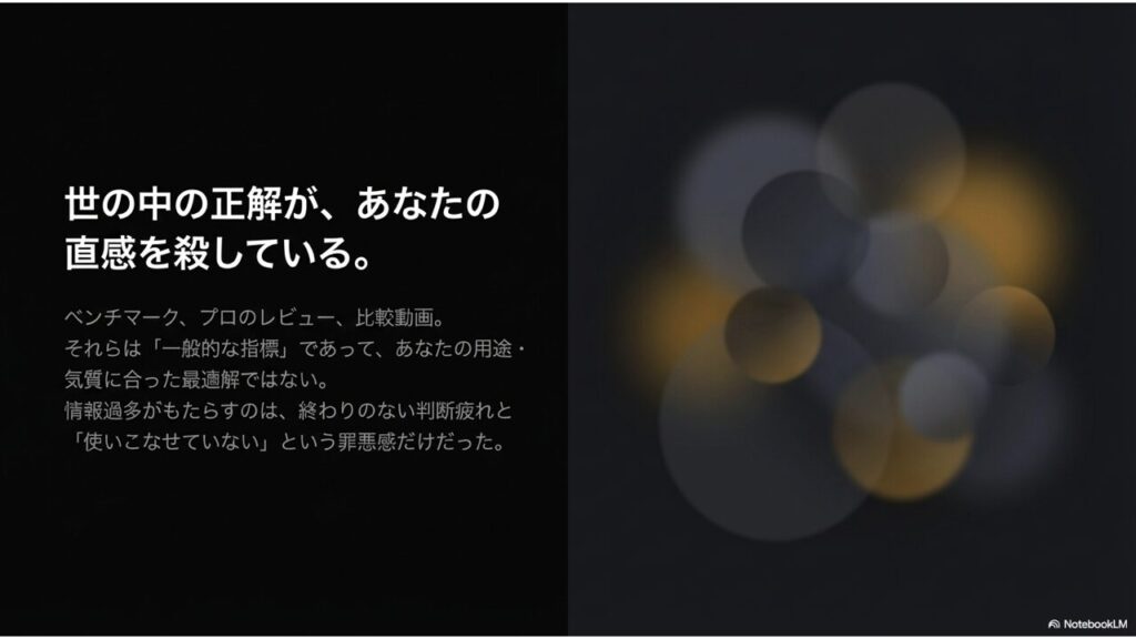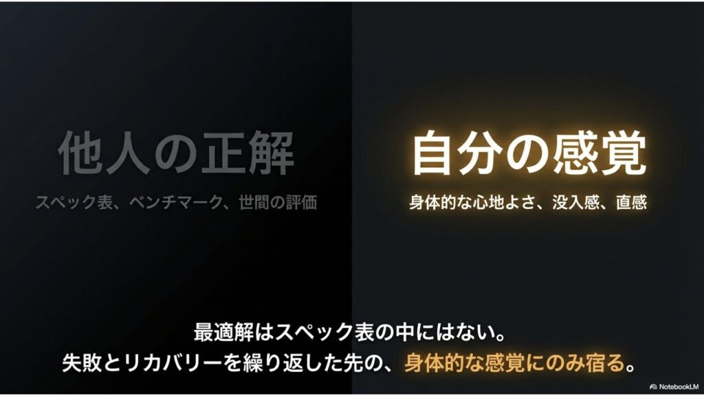 スペック表を読み込む力ではなく、実際に手に取り、使い込み、時には「これじゃなかった」と後悔する。その繰り返しの中でしか、あなただけの「用途の感覚」は洗練されません。