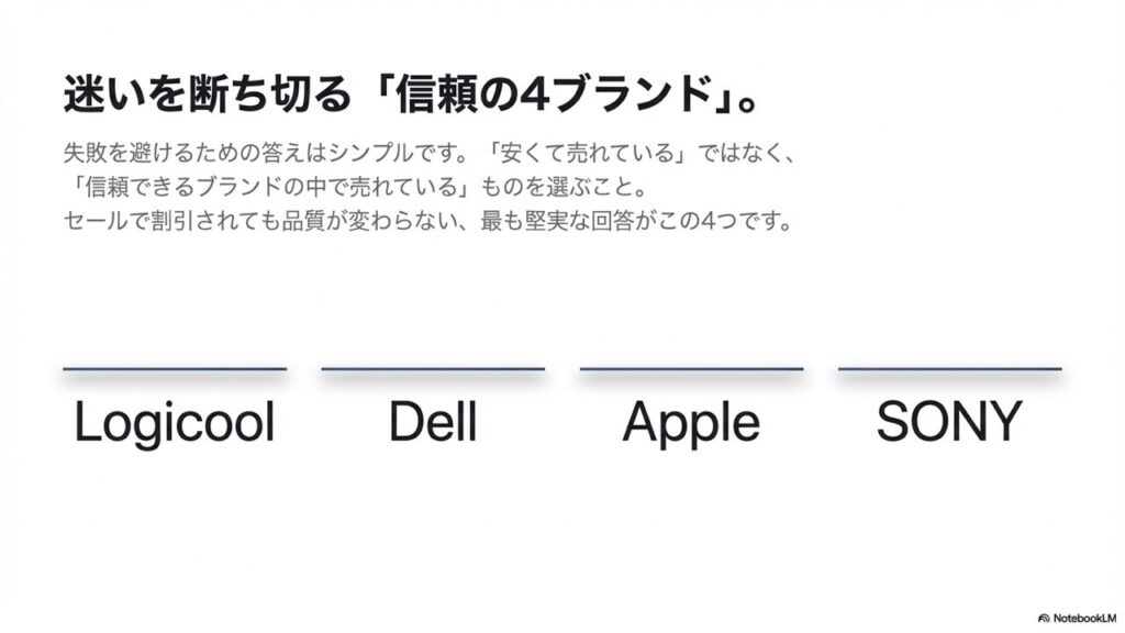 今回ピックアップしたのは、ロジクール、Dell、Apple、ソニーの4ブランド。いずれも信頼性が高く、セールで割引されても「品質は変わらない」という安心感を持っています。