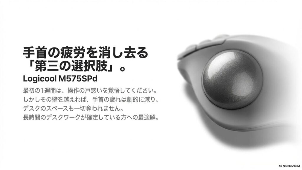 トラックボールは好みが分かれるデバイスですが、一度慣れると手首の疲れが劇的に減ります。デスクのスペースも取りません。長時間のデスクワークが確定している方は、試してみる価値があります。