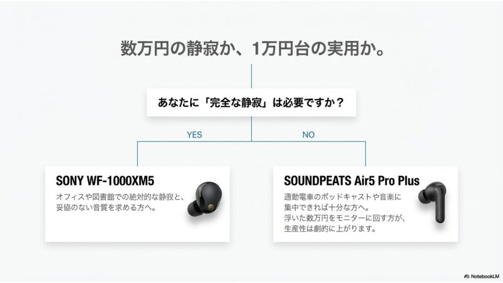 私自身、ソニーのイヤホンを使ってきた時期があります。ノイズキャンセリングの性能は確かに素晴らしいのですが、ふと感じたんです。「この性能差に、数万円の上乗せをする必要があるのか」と。
