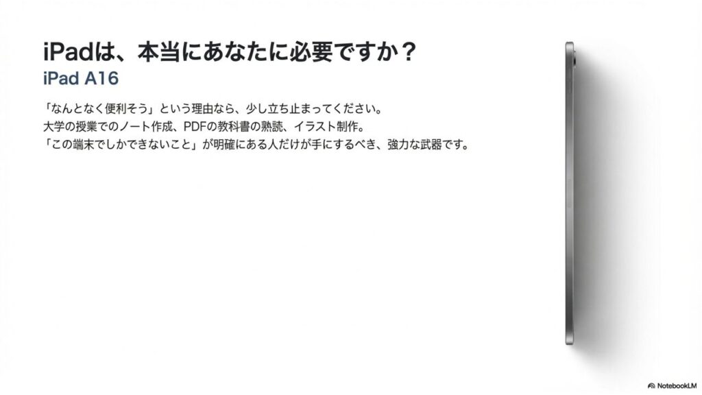一方で、「なんとなく便利そうだから」「みんな持っているから」という理由だけなら、少し立ち止まってみてもいいかもしれません。スマホとノートPCがあれば、大半の作業はカバーできます。