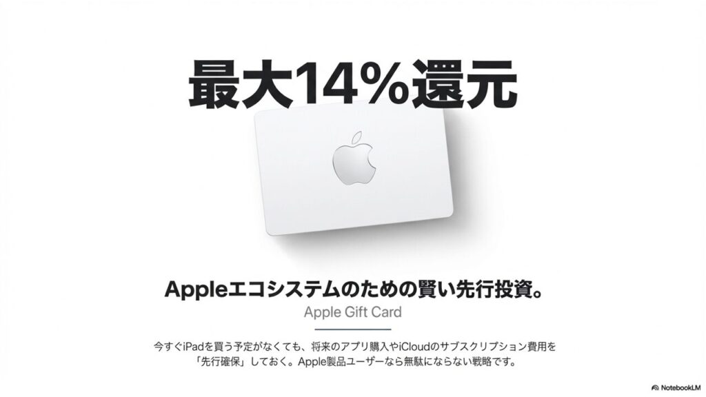 最大14%のポイント還元が付くセール期間中にGift Cardを購入しておけば、将来のアプリ購入やiCloudのサブスク費用を「先行確保」できます。使い道が決まっていなくても、Apple製品を使っている限り無駄にはなりません。