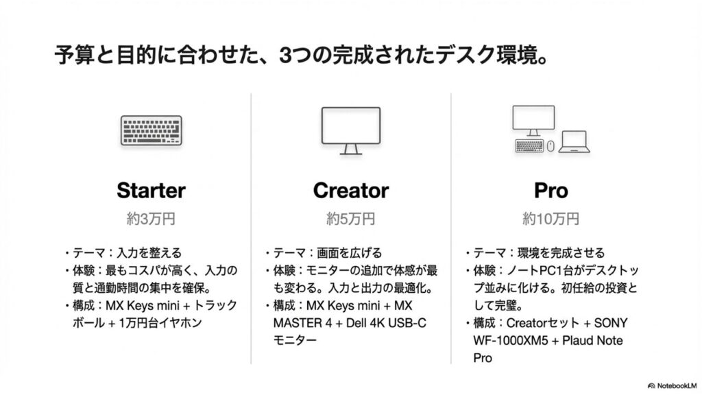 ここまで読んで、「結局どれを買えばいいの?」と思った方のために、予算別の組み合わせを提案します。