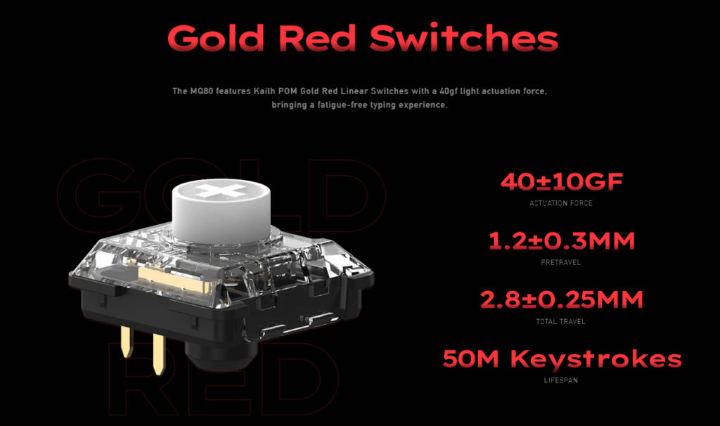 とにかくスムーズかつ軽快な打鍵感です。搭載されているキースイッチは「Kailh POM Gold Red Switches」。荷重が40gfなので、とても軽やかにタイピングできるキースイッチです。それでいて安定感もあり、ただ軽いだけじゃなく「ちょうどいい重み」も感じられます。