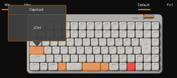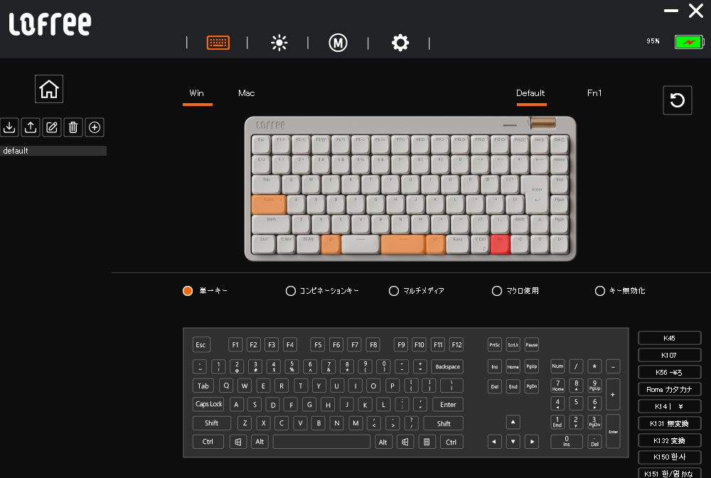 キーマッピングはLofreeの専用ソフトウェアで設定可能です。分割スペースバーを有効活用するなら、必須のソフトウェアと言えます。